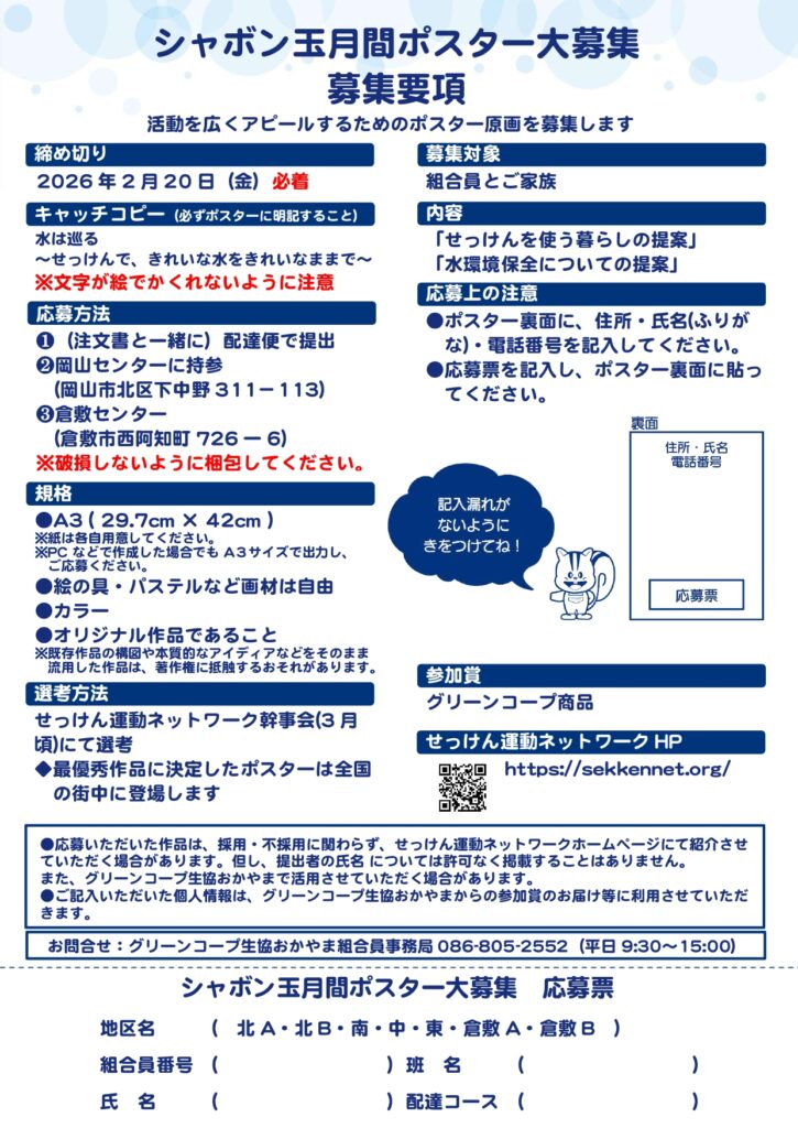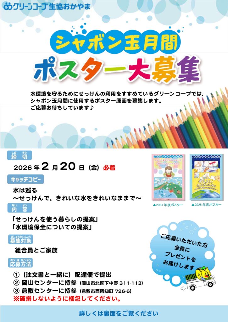グリーンコープ生協おかやまが会員団体となっている“せっけん運動ネットワーク”では、2026年度のシャボン玉月間に使用するポスターの原画を募集しています!