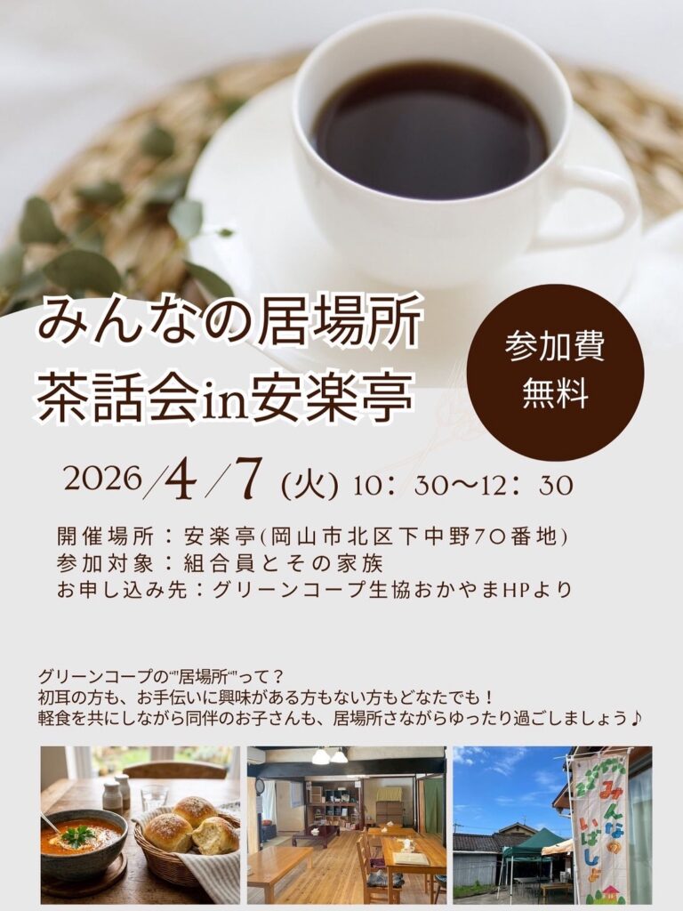 グリーンコープ生協おかやまでは2023年6月より、地域の誰もが集える「みんなの居場所」を開設しています(毎月第1火曜日)。