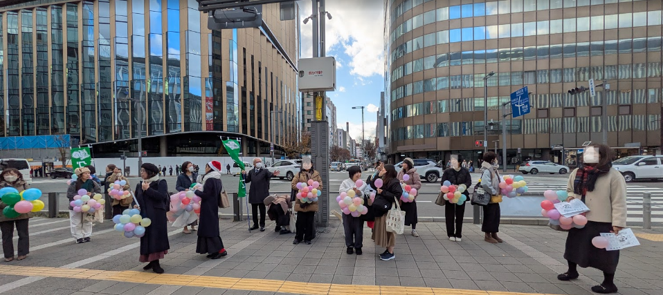 集会の最後に、博多駅前でアピール行動を行いました。組合員によるマイクパフォーマンスのもと、小さい風船と託送料金訴訟のリーフレットやグリーンコープでんきの冊子を手に、道行く人に声をかけました。高校生~高齢者まで幅広い人に冊子を手にしていただくことができ、少しでもこの問題を一緒に考えていただくきっかけになれたのではと思い、今後このような機会を増やせたらと思いました。