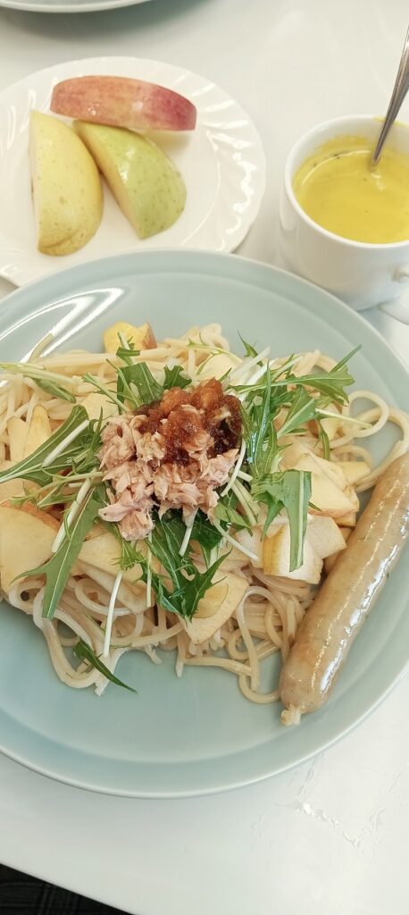 報告会と並んでお楽しみの試食は、びん牛乳と北海道産かぼちゃのスープ・産直りんごソースのパスタ、新商品あらびきソーセージ(やさい入り)、産直りんご3種の食べ比べでした。それぞれのおいしさを味わえる試食の内容にも満足しました。