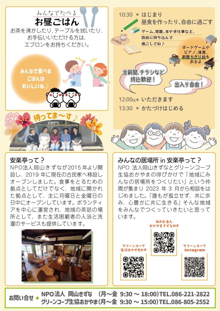 居場所では、共済のお見舞金に添える折り鶴づくりや自生GMナタネ調査のリリース準備など、グリーンコープの取り組みを一緒に行うこともあり、その際に、それぞれの得意が発揮されたり、そこから会話が広がったり、「役に立てた」「ありがとう」と互いに喜びを感じる様子が見受けられました。